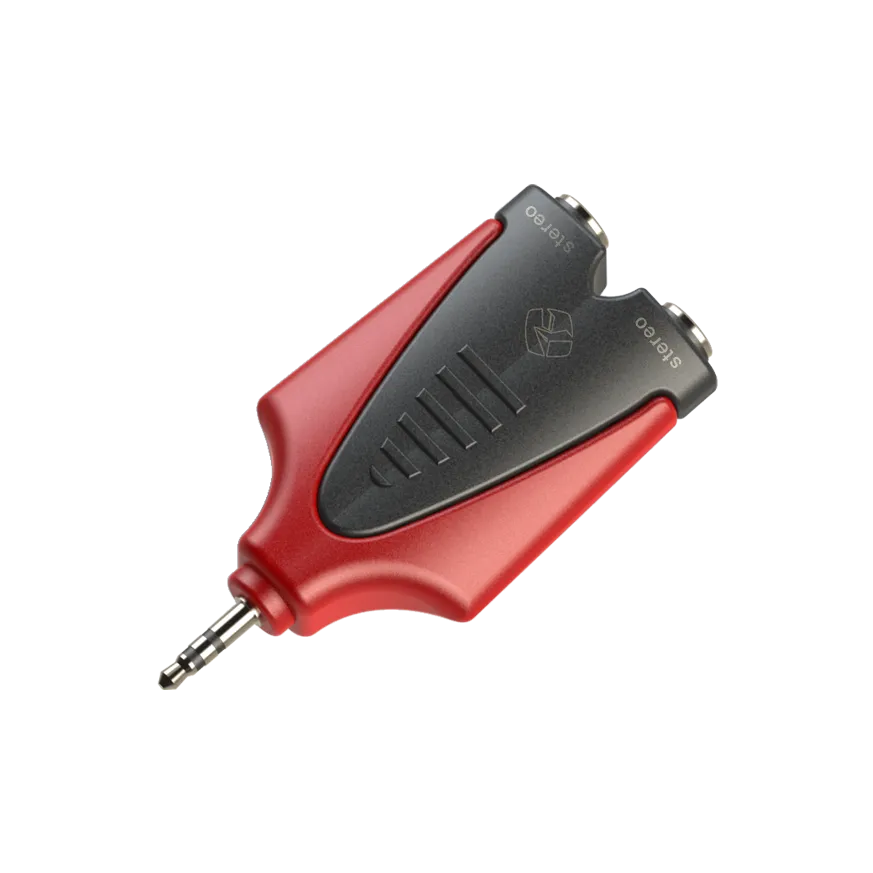 Переходник Roxtone RPAN320: Jack 3,5 мм (стерео) «папа» — 2 x Jack 6,3 мм (стерео) «мама». Цвет — чёрно-красный.