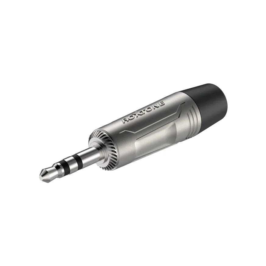 Стерео-разъём JACK 3,5 мм Roxtone RMJ3P-NN с никелевым покрытием корпуса и контактов. Имеет резиновый держатель для кабеля. Цвет — серебристый.