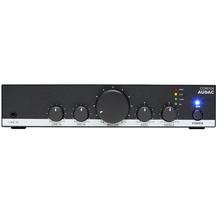 AUDAC COM104 - это однозонный микшер-усилитель, который идеально подойдет для построения трансляционных систем оповещения и фонового озвучивания небольших помещений, например кафе, рестораны, офисы, магазины или бары. Выполнен в компактном металлическом корпусе, благодаря чему его можно легко установить в любую нишу или закрепить в 19” RACK стойку. Построен на архитектуре класса D, имеет максимальную выходную мощность в 40 Вт и поддерживает подключение как низкоомных акустических систем (4 Ом), так и трансформаторных громкоговорителей для работы в линии 70/100 В. Оснащен встроенным блоком питания с широким диапазоном входного напряжения от 100 до 240 В AC, то есть будет работать практически от любой сети переменного напряжения. Дополнительно имеется активная защита от КЗ, перегрева и перегрузки, а также ограничения сигнала в линии.Для подключения источников звука или внешних микрофонов, данный усилитель оборудован 1х 3-pin EuroBlock микрофонным входом с поддержкой фантомного питания 15 В DC, 1х RCA линейным входом на тыльной части корпуса и 1х 3.5 мм Jack линейным входом на лицевой части корпуса. Из регуляторов имеются поворотные регуляторы усиления для микрофонных и линейных входов, регуляторы громкости, баса и тембра, а также мастер регулировка. Дополнительно предусмотрен приоритетный вход, который активирует режим приоритета голосовых сообщений на случай аварии или любой другой чрезвычайной ситуации.