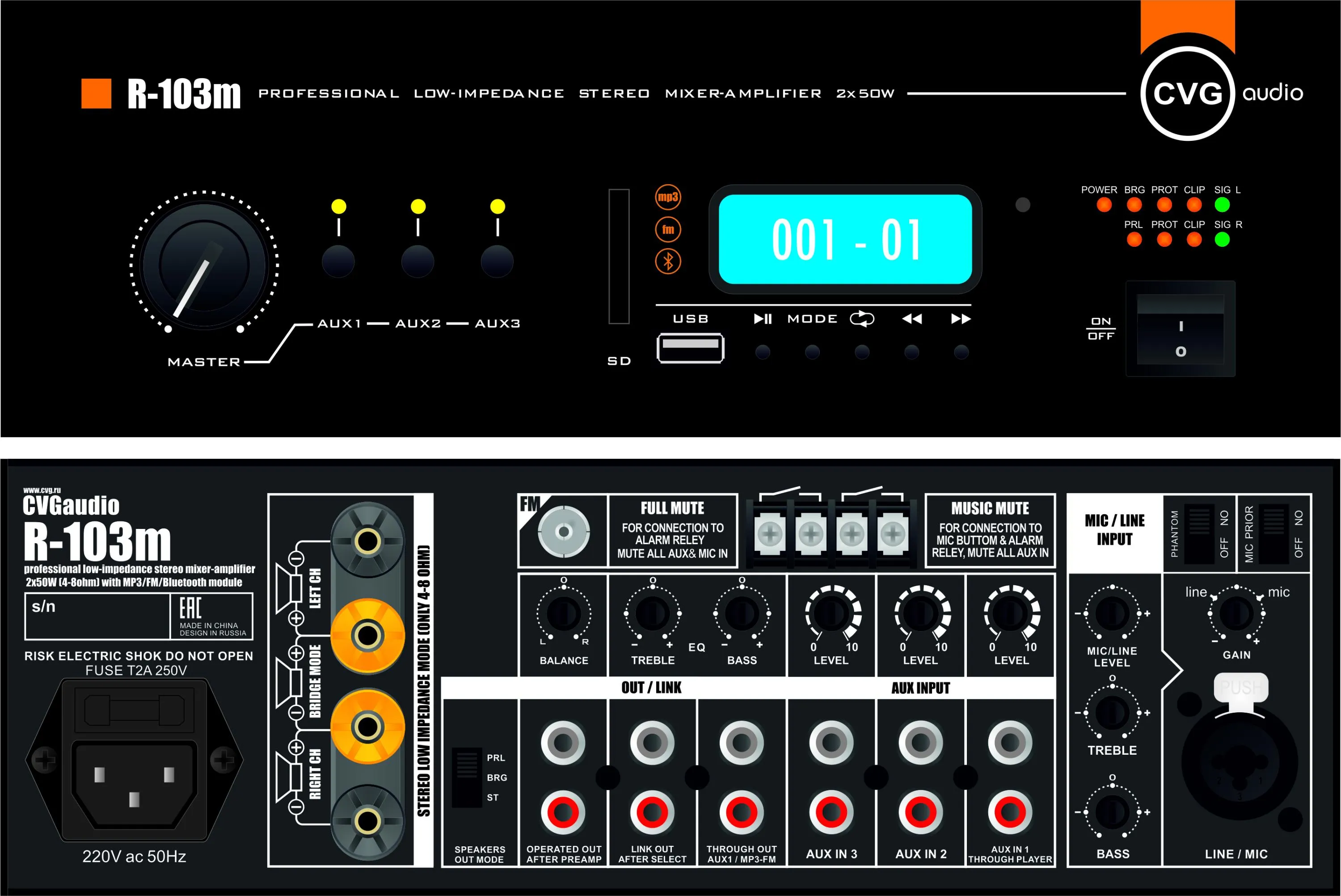 CVGaudio R-103m — миниатюрный микшер-усилитель для систем фонового звука. Мощность: 2х50W при 8ohm, 2х75W при 4ohm. Диапазон сопротивления нагрузки: 4–8ohm. Режимы работы: stereo/parallel/bridge.