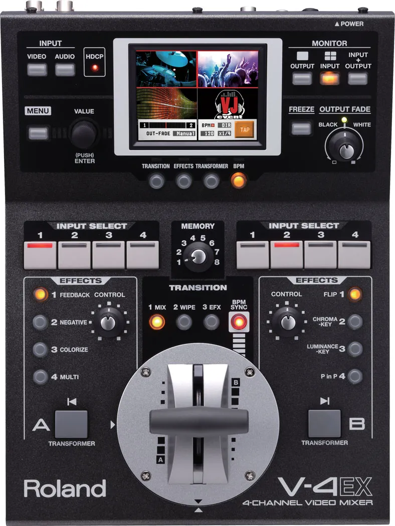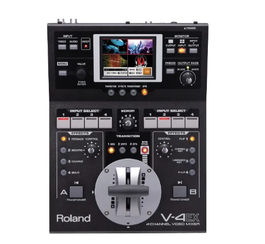 Видеомикшер Boss V-4EX, обеспечивающий качественные видеоряд и потоковое вещание по сети, является дальнейшим развитием семейства легендарных видеомикшеров V-4 и V-8, предлагая новые опции, такие как вход/выход HDMI, прогрессивная внутренняя обработка, внедрение аудио, потоковая передача по USB и встроенный сенсорный монитор.Универсальные и уникальные функции Roland V-4EX предопределяют возможность использования этого микшера в самых разноплановых приложениях, включая проведение клубных, концертных, культовых, событийных, образовательных, свадебных, обучающих и спортивных мероприятий. V-4EX отличается компактным плоским дизайном, удобным для использования в портативных приложениях, а также стационарных инсталляциях, когда "размер имеет значение".