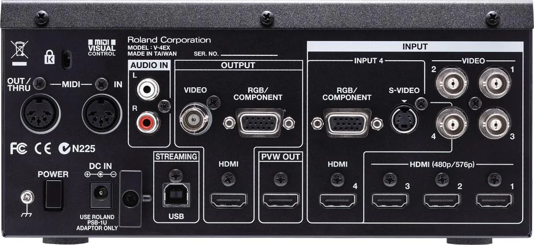 Roland V-4EX задуман как коммутатор для производства продукции в режиме реального времени, а также как устройство, реализующее функции потокового вещания по сети. Поэтому он поддерживает внедрение аудио, оборудован встроенным аудиомикшером и предусматривает возможность задержки аудио на 4 кадра для синхронизации с видеорядом (липсинга). Предусмотрена работа с видео формата HDCP, позволяющая микшировать защищенный от копирования материал, например, с игровых консолей или дисков Blu-ray при производстве собственной продукции в прямом эфире. Входы HDMI с первого по третий поддерживают работу с разрешениями до 480p/576p, четвертый вход HDMI предусматривает прием сигналов с разрешением вплоть до 1080р, а RGB — вплоть до WUXGA (1920x1200). Несмотря на то, что внутренняя обработка основана на стандарте SD, выходной сигнал можно масштабировать до 1080p или 1920x1200.