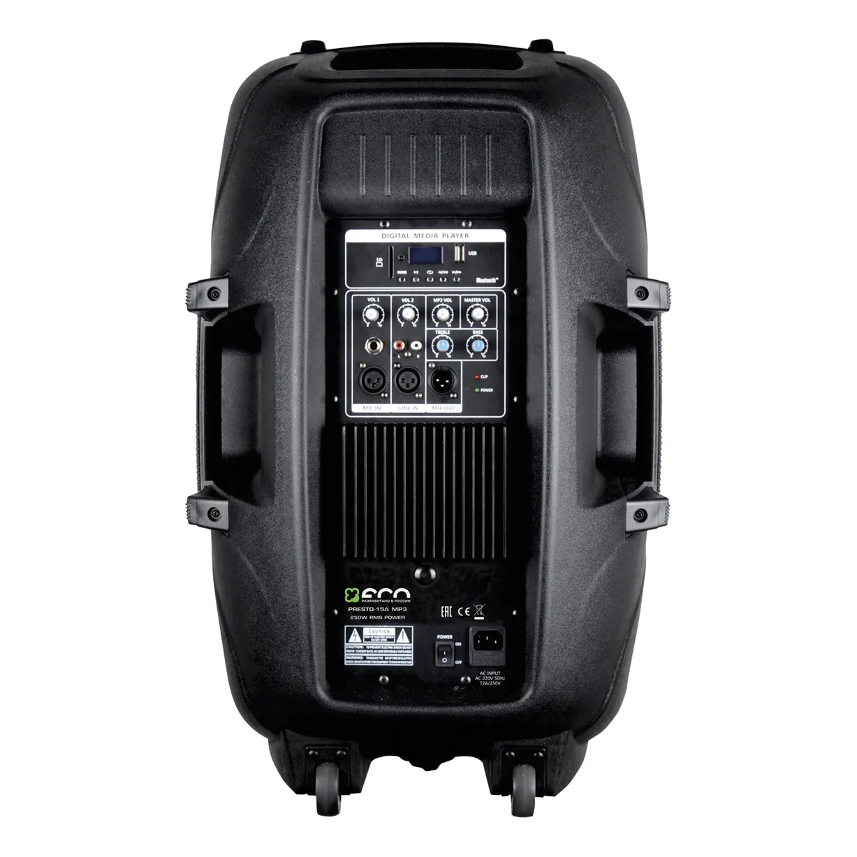 Акустическая система ECO Presto-15A MP3 — это активная модель со встроенным MP3-плеером и Bluetooth. Она оснащена усилителем мощности и имеет пластиковый корпус с запатентованным материалом, который обеспечивает высокую скорость затухания звуковой волны. Это приближает звучание к акустическим системам с фанерным корпусом, но с меньшей массой. Система удобна в транспортировке благодаря колёсикам и подходит для различных мероприятий.
