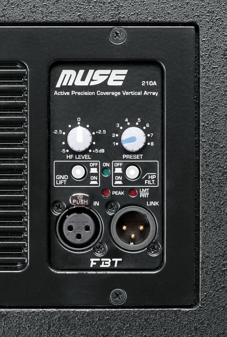 Активная акустическая система линейного массива FBT MUSE 210LA разработана на базе самых передовых технологий звукоусиления. Модуль оснащен двумя 10-дюймовыми динамиками и двумя компрессионными драйверами B&C Speakers. Волновод оптимизирован путем высокоточного BEM моделирования конечных элементов для нейтрализации нежелательных искажений, и обеспечивает широкую горизонтальную дисперсию 90°. FBT MUSE 210LA имеет встроенный сигнальный процессор, который предлагает 8 различных пресетов для оптимизации звучания, что позволяет быстро настроить систему в соответствии с кривизной подвесного кластера и числом используемых элементов массива. Цифровое раздельное усиление ВЧ и НЧ секций и блок питания с функцией автоматической коррекции мощности обеспечивают высокую производительность данной акустики. Кабинет из березовой фанеры в равной степени прочный, практичный и стильный. Интегрированная в корпус система подвеса позволяет изменять угол наклона каждого элемента в кластере от 0° до 10° с шагом в 2°. Также предусмотрены две ручки из литого алюминия.Технические характеристики FBT MUSE 210LA: