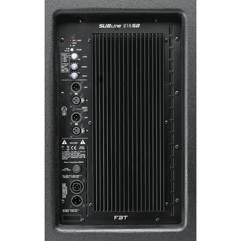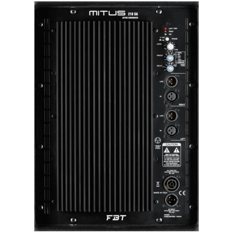 FBT MITUS 218SA - активный сабвуфер мощностью 2000 Вт с двумя 18" вуферами с диаметрами звуковых катушек 4 ". Есть встроенный DSP-процессор с 6 эквализационными пресетами и Delay-процессор с возможностью выбора времени задержки от 0-3,5 мс. Корпус кабинета выполнен из 18 мм березовой фанеры с краской, устойчивой к износу и царапинам. На корпусе кабинета расположены шесть ручек для удобной транспортировки.Компания FBT предлагает отличное звучание акустических систем и простоту установки благодаря гибкости монтажа. Сабвуфер FBT MITUS 218SA классической компоновки, созданный с использованием современных технологий. Этот излучатель имеет усиленную корзину с большим количеством отверстий для свободного прохождение воздушного потока, и мощнейшую магнитную систему. Для создания оптимальных условия для работы НЧ-динамика сабвуфер имеет специальную полость в нижней части корпуса. Корпус сабвуфера не создает призвуков даже при работе на максимальной громкости. Закрытая акустическая компоновка предотвращает возникновение резонанса, значительно искажающего звук при воспроизведении громких ударных басов. Благодаря лаконичной внешности и очень высокому качеству изготовления аппарат хорошо впишется в современный интерьер.