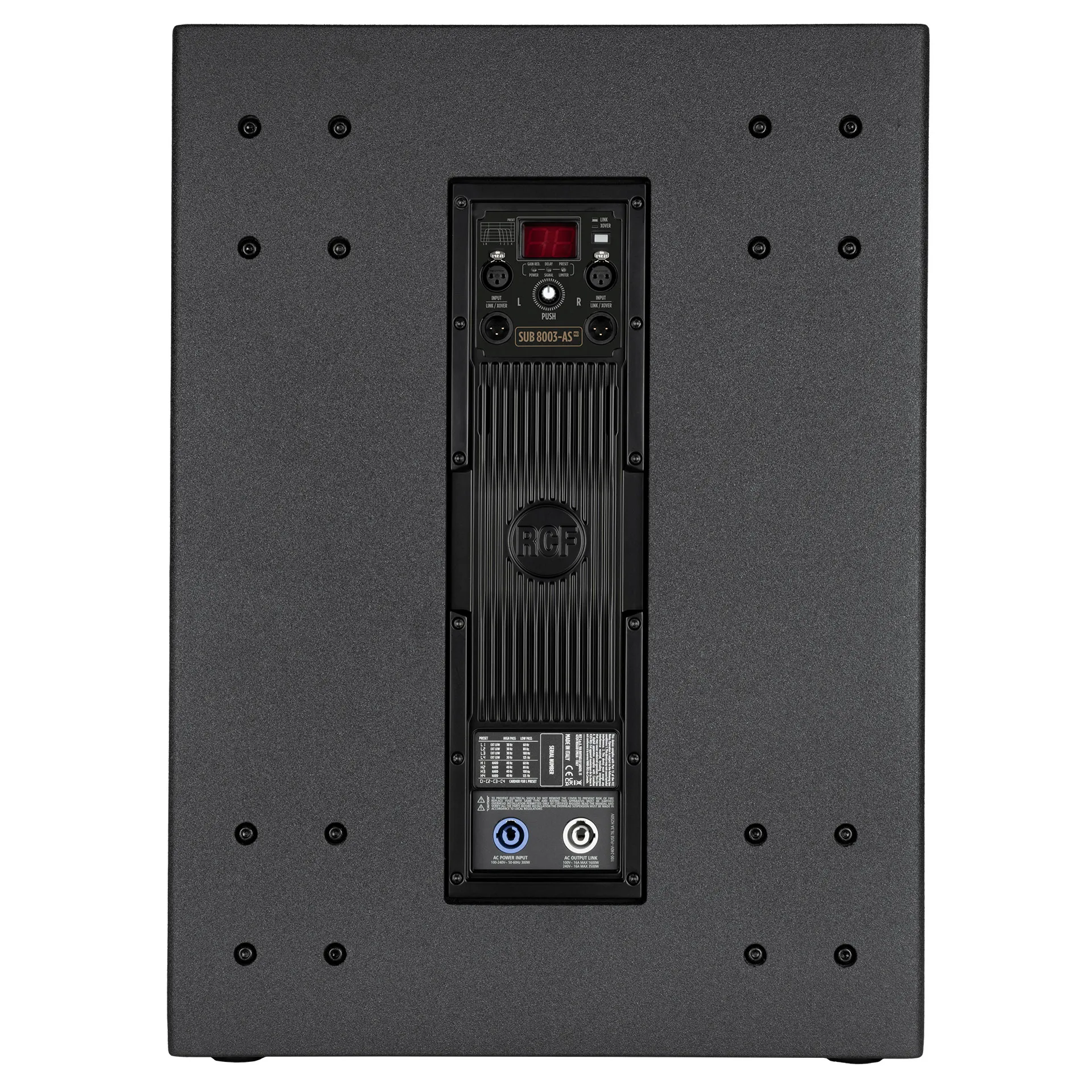 Описание сабвуфера RCF SUB 8003-AS MK3RCF SUB 8003-AS MK3 — активный сабвуфер с 18-дюймовым динамиком и 4-дюймовой звуковой катушкой. Максимальная мощность до 2200 Вт и диапазон частот от 35 до 120 Гц обеспечивают глубокие и чистые басы. Цифровой усилитель достигает уровня звукового давления до 135 дБ, гарантируя высокую громкость без искажений. Встроенный аудиоконтроллер с эквалайзером, кроссовером и регулируемой задержкой позволяет настроить сабвуфер под любые требования.