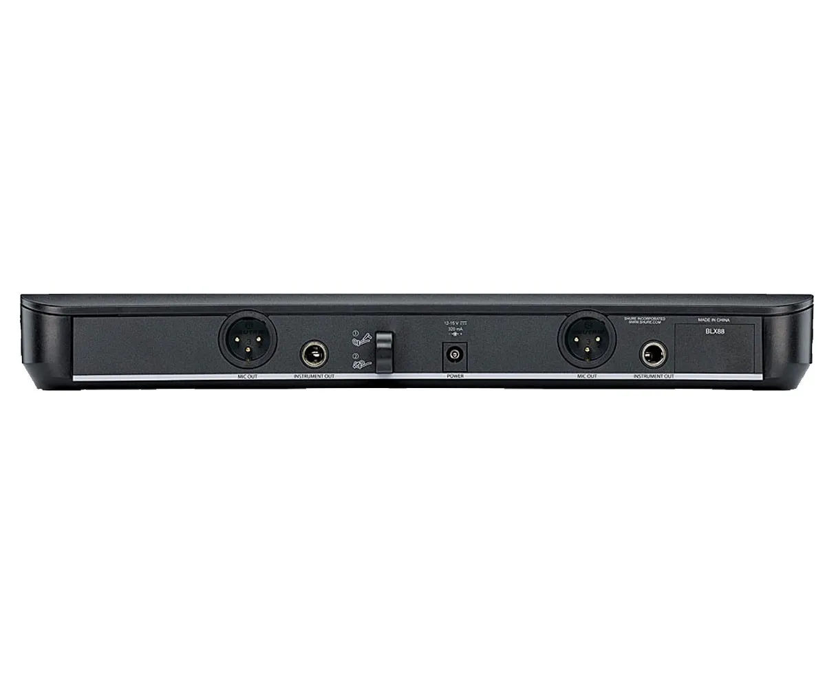 В комплекте: двухканальный приёмник BLX88, два передатчика BLX2/SM58, блок питания, батареи АА, держатели для микрофонов.