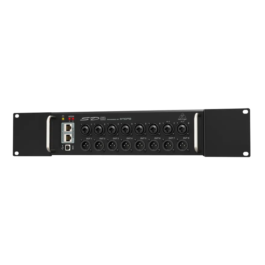 Behringer SD8 — стейджбокс с 8 входами и 8 выходами для цифровых микшеров. Включает 8 программируемых микрофонных предусилителей MIDAS, 8 аналоговых XLR выходов. Поддерживает каскадирование через AES50 и подключение микшера персонального мониторинга через Ultranet. Позволяет работать удалённо через Cat5e до 100 м. Есть USB для обновления системы.