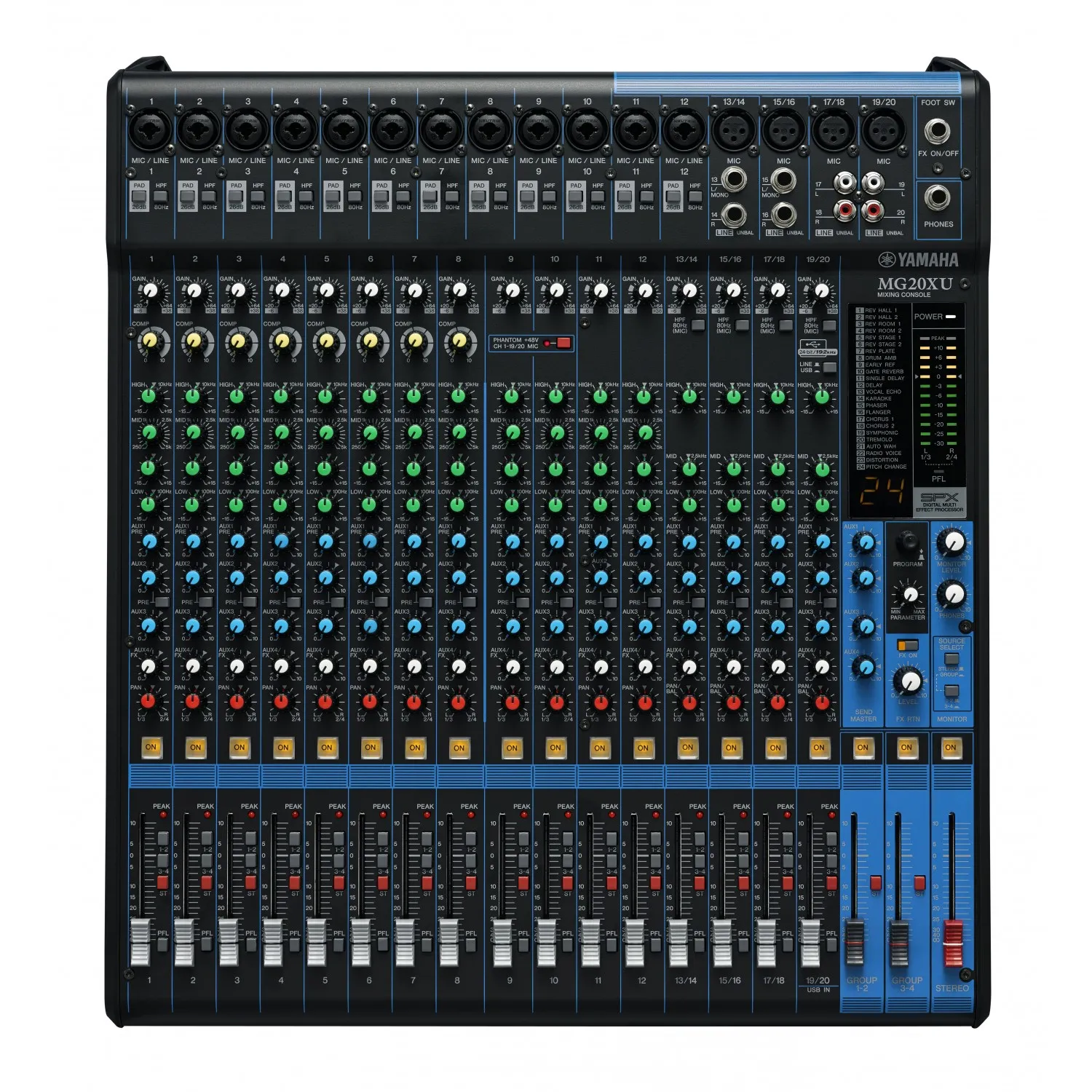 Эффекты придают блеск и долю профессионализма миксам в любой музыкальной или немузыкальной сфере применения. Модели MG X/XU оснащены SPX-процессором Yamaha с набором из 24 редактируемых цифровых эффектов, которые делают глубже звучание речи и придают новые оттенки музыкальному исполнению. В частности, высококачественные ревербератор и дилэй расширяют пространственные свойства звука, придавая ему высокую степень реализма. Система дополняется ножным переключателем FC5 для включения/выключения эффектов. (MG10XU / 12XU/16XU/20XU)