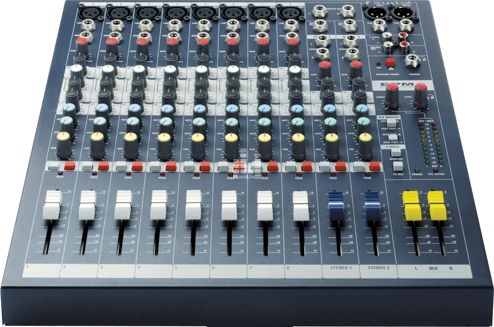Модель Soundcraft ЕРМ8 – стильный аналоговый микшер, который во многом похож на пульты серии Soundcraft Spirit E. Отличие заключается лишь в применении предусилителей GB-30. Такие же предусилители установлены в консолях серий GB4, GB8 и LX7II. GB-30 имеют большую разрешающую способность (усиление 55дБ) и перегрузочный запас +22дБ.
