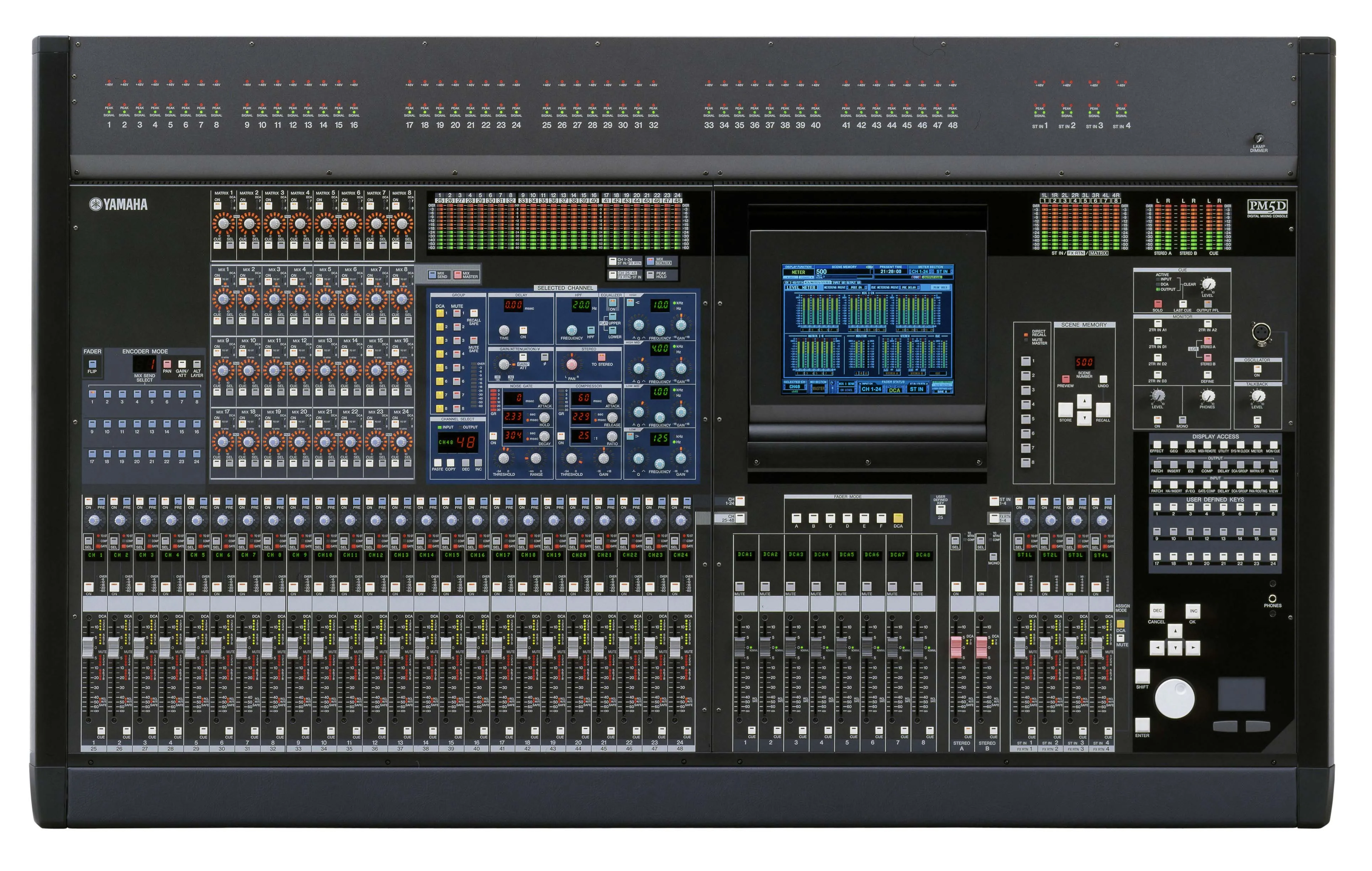 Управление консолью PM5D знакомо любому, кто уже работал с другими консолями Yamaha - в качестве примера можно привести секцию Selected Channel и Scene. Но в модели PM5D эти функции управления были улучшены и оптимизированы для живых выступлений, а акцент был сделан на быстрый и удобный доступ. Некоторые функции переняты от флагмана линии цифровых консолей PM1D, например, 25 клавиш, назначаемых пользователем, и восемь клавиш Direct Recall для восстановления шаблонов настроек. Функция "Fader Mode" позволяет назначать DCA-фейдерам различные операции, что обеспечивает быстро и централизованное управление параметрами, а с помощью клавиш Encoder Mode можно быстро назначить разные функции регуляторам каналов. Если вы предпочитаете традиционный метод идентификации каналов, между регуляторами каналов и клавишами пользователя есть место для подписи клавиш. Консоль способно полностью сохранять и восстанавливать все настройки с использованием функции "Recall safe", позволяющей избежать изменение определенных параметров.