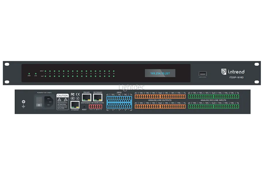 ITDSP-1616Dv2 имеет поддержку аудио Dante / AES67 16х16 каналов, primary и secondary порты для целей резервирования, управление через отдельный порт Ethernet, а также дополнительные 8 многофункциональных портов GPIO.