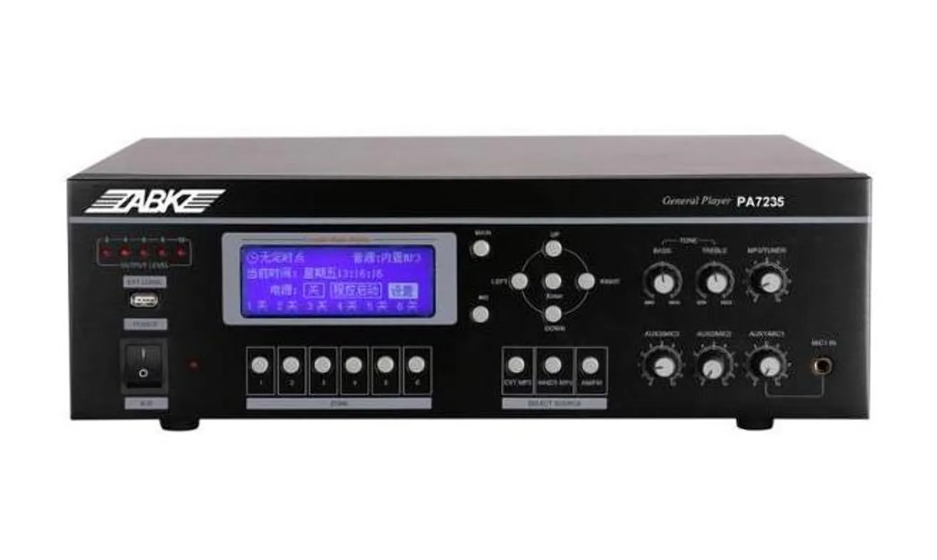 Мульти-плеер ABK PA-7235 – устройство для воспроизведения аудио с USB. Имеет 6 зон с возможностью управления через точки синхронизации. Встроенная память 1 ГБ и AM/FM тюнер с 40 радиостанциями. 3 микрофонных, 3 линейных входа и 1 линейный выход. 2 временных плана на 7 дней. 5 светодиодных индикаторов. Мощность RMS – 350 Вт. Многоуровневая настройка.