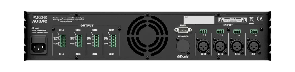 Задняя панель снабжена аудиовходами на разъемах XLRf и Euroblock 3-pin, клеммниками Euroblock 4-pin для подключения 100 В линий АС и портом RS-232 для внешнего удаленного управления. Дополнительно предусмотрена возможность установки опционального сетевого интерфейса Dante™, позволяющего выполнять прием/передачу звукового сигнала высокого качества и с минимальной задержкой по стандартной сети Ethernet.
