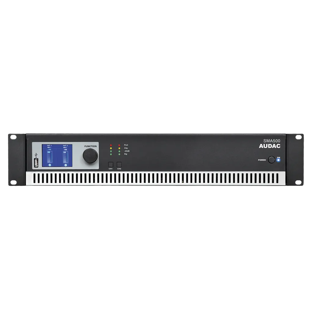 AUDAC SMA500 - это двухканальный усилитель мощности класса D, предназначенный как для стационарных, так и для туровых комплексов звукоусиления.Прежде всего, данная модель оснащена цифровым информативным ЖК дисплеем, на котором отображается текущий режим работы усилителя, и все необходимые настройки и параметры. Также, на его передней панели расположен цифровой порт USB, который в свою очередь позволяет загружать на внешний накопитель пользовательские предустановки, а так же выполнять роль USB-ключа. Стоит отметить, что вход в систему при наличии вышеупомянутого ключа может осуществляться на двух уровнях: "Администратор" и "Пользователь". Дополнительно, в усилителе предусмотрен управляющий цифровой порт стандарта RS-232.