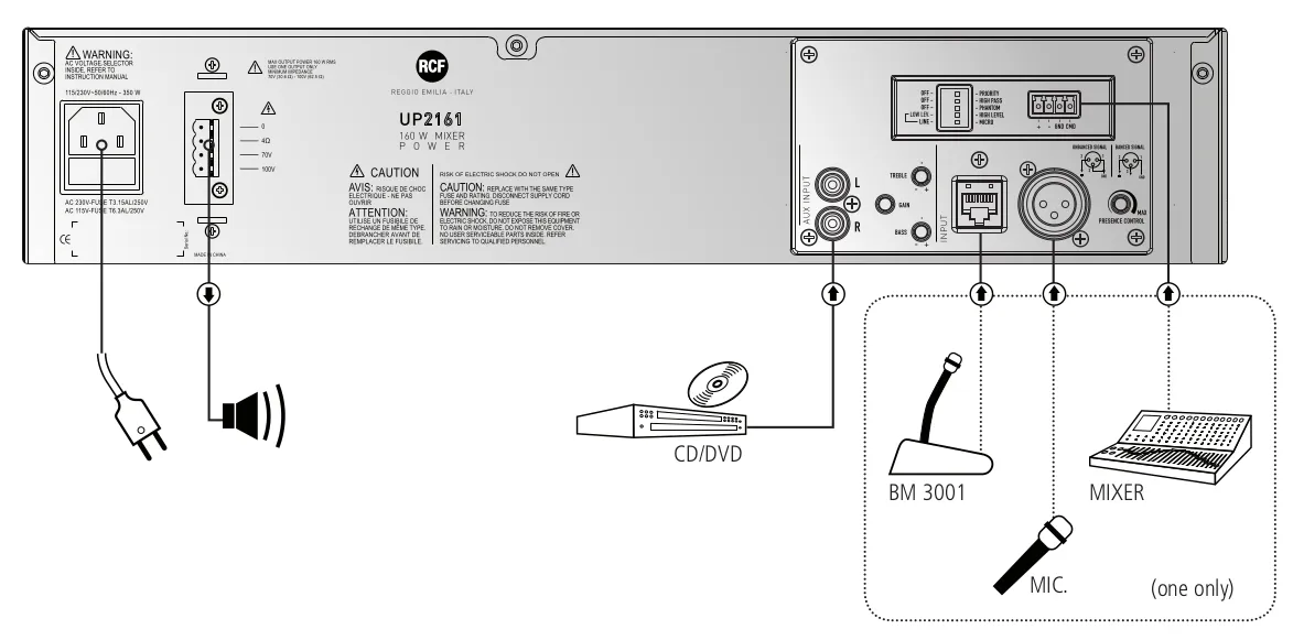Описание усилителя RCF UP 2321Усилитель RCF UP 2321 — это мощное устройство (320 Вт) для трансляции объявлений и музыки. Подходит для конференц-залов, гостиниц, ресторанов, торговых центров, офисов, промышленных объектов и образовательных учреждений. Имеет микрофонную линию, работает с разъёмами XLR или RJ 45 для главного входа и RCA для музыкальных источников. Выход доступен для громкоговорителей с низким импедансом и трансляционных линий 70–100 В. Усилитель класса D обеспечивает высокое качество звука и отличается компактностью.
